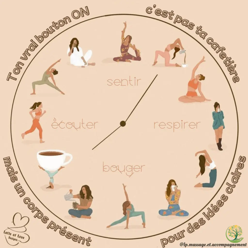 Puis prends quelques minutes pour respirer, bouger, t’étirer, t’auto-masser — peu importe la forme. Ce qui compte, c’est l’intention et la régularité. Reconnecte. Ressens. Considère les infos précieuses que ton corps t’envoie.